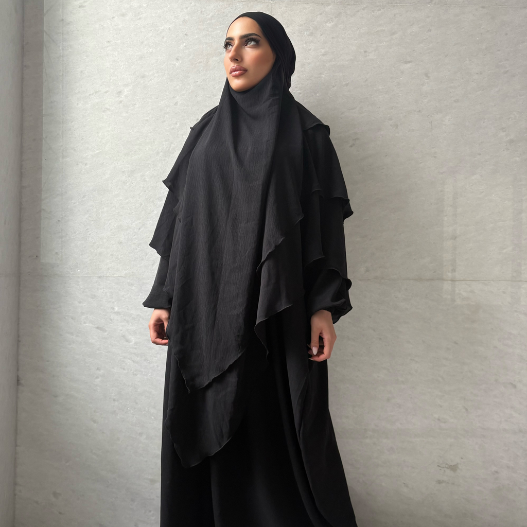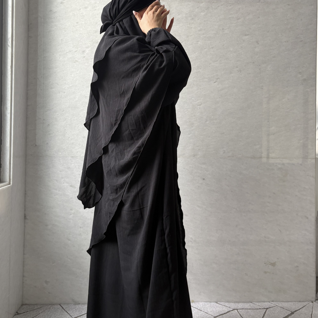 THE PREMIUM JILBAB AND ABAYA MASJID SET WAS DESIGNED TO ALLOW MAXIMUM COMFORT AND FULL COVERAGE. FEATURING BEAUTIFULLY LAYERED JILBAB WITH A TIE-UP DESIGN FOR A SECURE AND ADJUSTABLE FIT. IT ALSO INCLUDES A LONG-SLEEVE CLOSED LOOSE-FIT ABAYA.