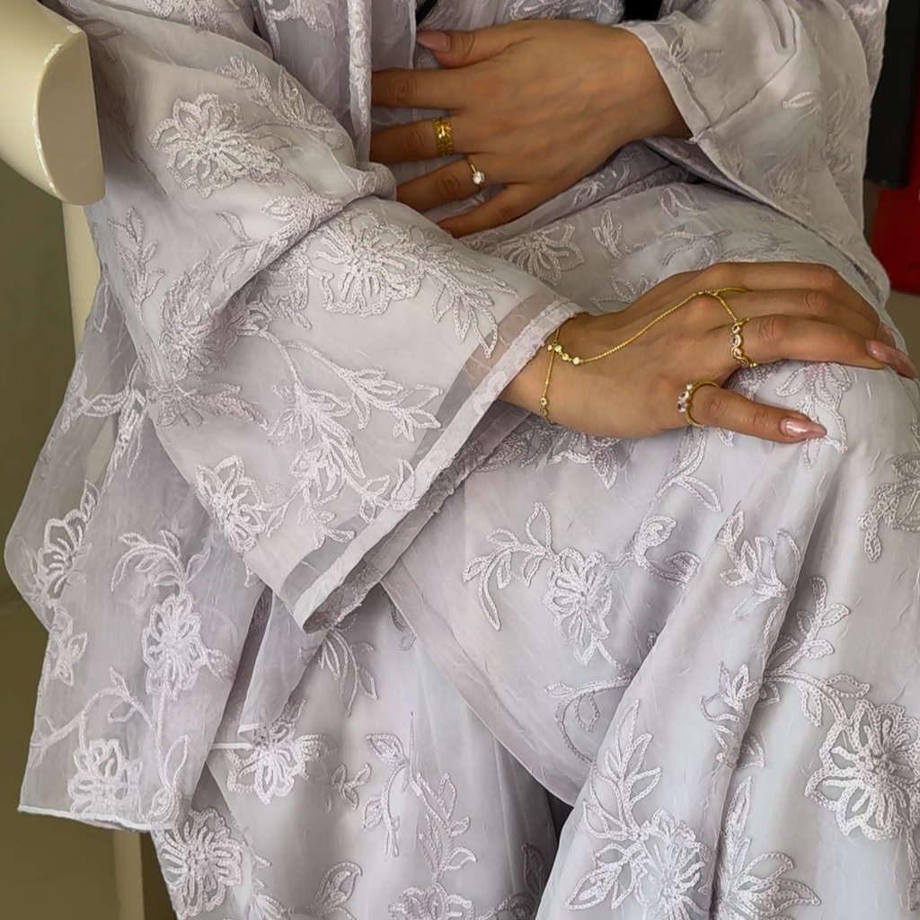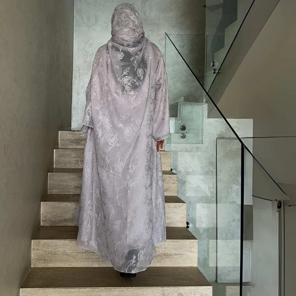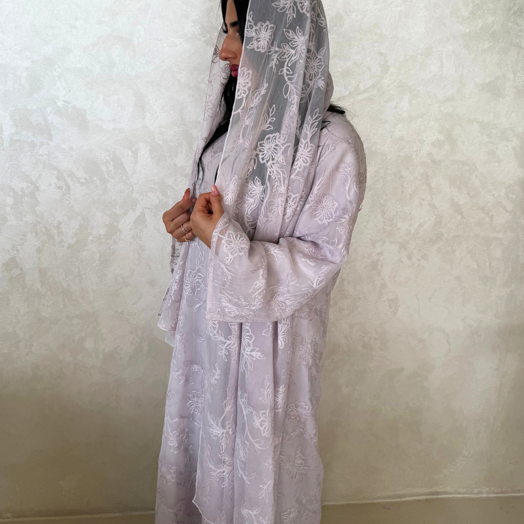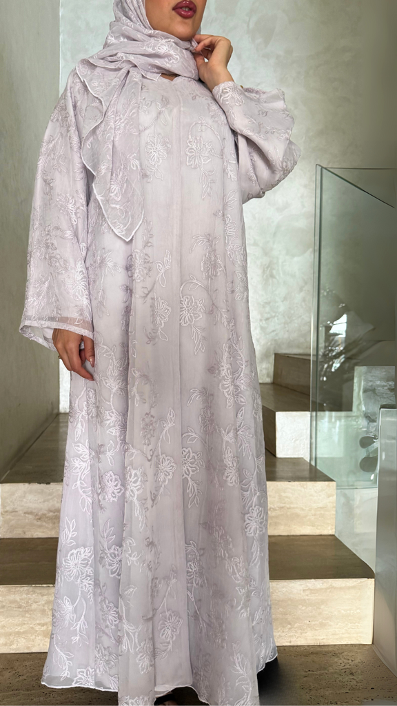 THE KHALEEJ SUMMER GARDEN LACE COLLECTION INTRODUCES LILAC BLOOM ABAYA, A DESIGN THAT IS UNIQUE AND TIMELESS. THE DOUBLE STITCHED ABAYA IS MADE FROM A PREMIUM LACED CHIFFON ON TOP OF ARMANI SILK ON THE INSIDE.