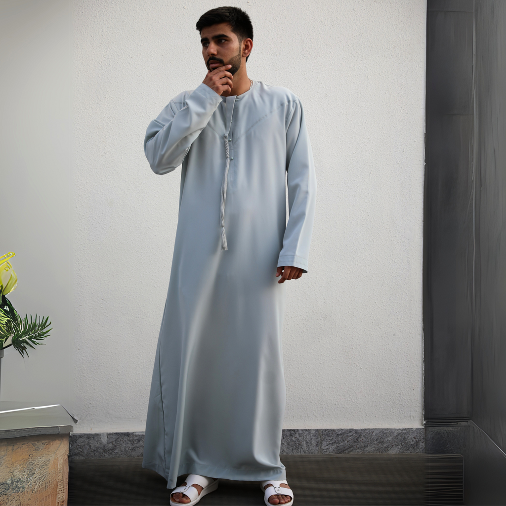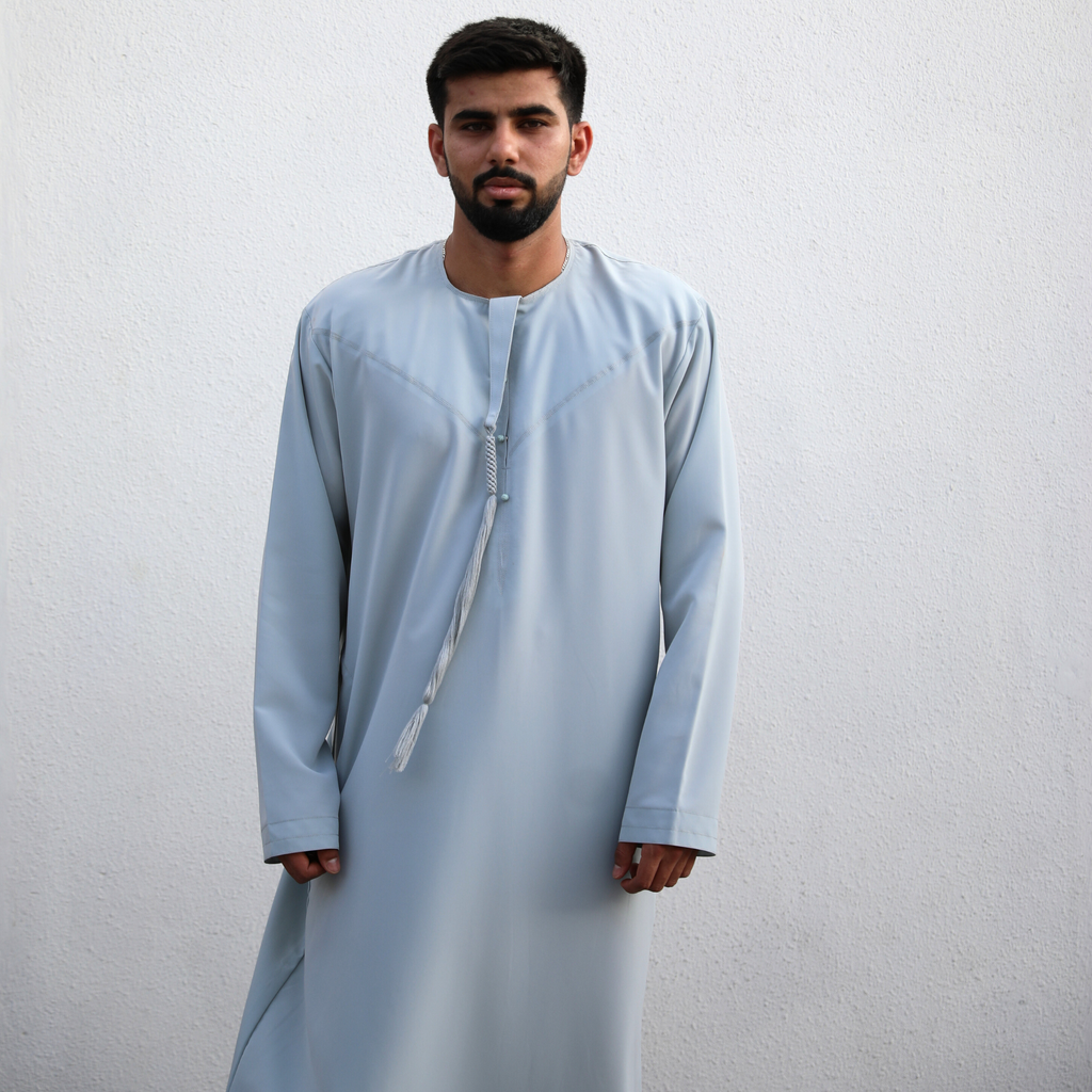 THE FALL MENSWEAR COLLECTION INTRODUCES THE EMIRATI STYLE KANDORA FEATURING A ROUND NECK COLLAR WITH 7-LINE STITCHING AND THE FAMOUS TASSLE.