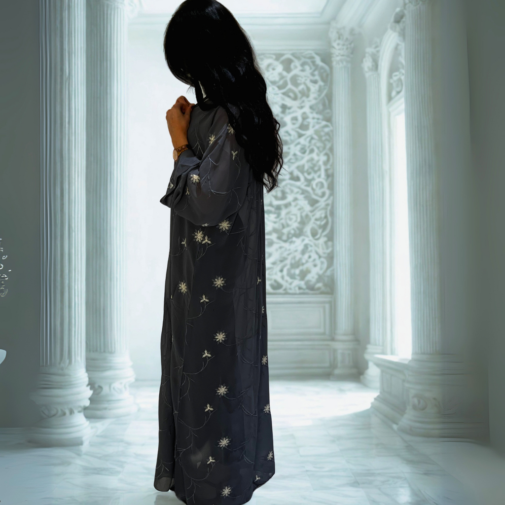 THIS ABAYA CAN ALSO BE WORN AS A KIMONO OPEN. THE CHIFFON MATERIAL IS SLIGHTLY SEE-THROUGH GIVING YOU A VERY LIGHTWEIGHT AND LUXURIOUS TOPPER FOR ANY UNDER-DRESS BRINGING YOUR OUTFIT TO A MORE ELEGANT AND MODEST FINISH