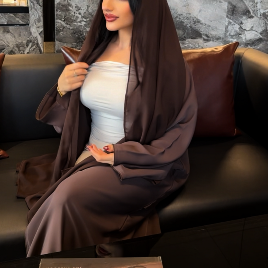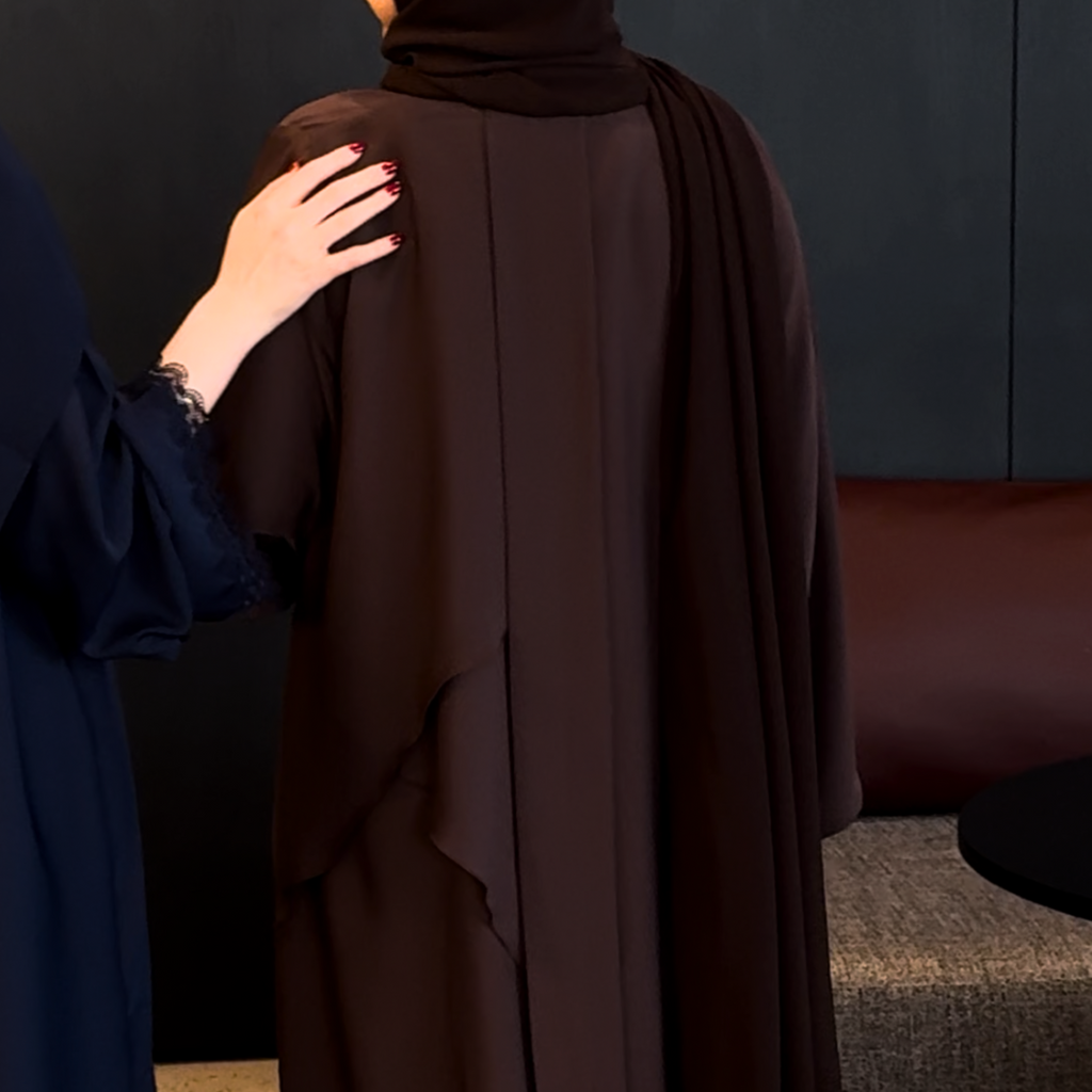 ELEVATE YOUR PROFESSIONAL WARDROBE WITH THIS SHOW-STOPPING CORPORATE ABAYA IN A RICH CHOCOLATE COLOUR DESIGNED FOR THE MODERN WOMAN WHO DEMANDS BOTH STYLE AND AUTHORITY AS IT BLENDS CLEAN TAILORING WITH A TOUCH OF DRAMA AND FEATURES A V-TAIL HEM THAT FLARES GENTLY AT THE BACK FOR A DRAMATIC FLOWING FINISH