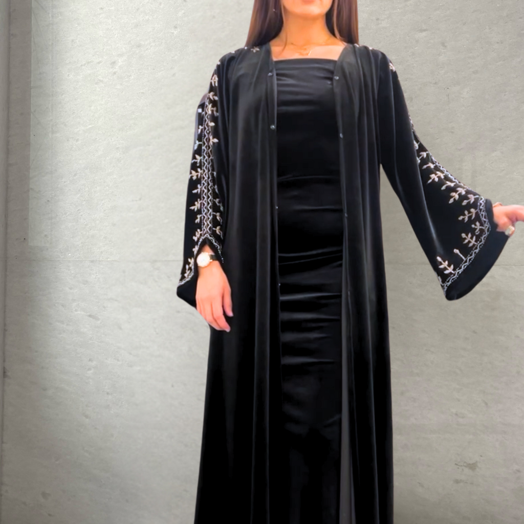 HAND-STITCHED TO PERFECTION, THE ROYALE VELVET ABAYA. THIS OPEN ABAYA FEATURES SEQUINS AND JEWELS AROUND THE SLEEVES FOR A ROYAL TOUCH. THE BELLE SLEEVES WITH A MODERN CUT SHOWCASE YOUR WRISTS, MAKING IT A STATEMENT OF ELEGANCE AND STYLE.